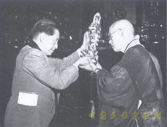 1995年8月17日出席日本禁止原子弹、氢弹世界大会的赵朴初居士,代表中国佛教协会向日本佛教会赠送观音菩萨像,由该会副椎尾辩匡法师接受。(资料图片)