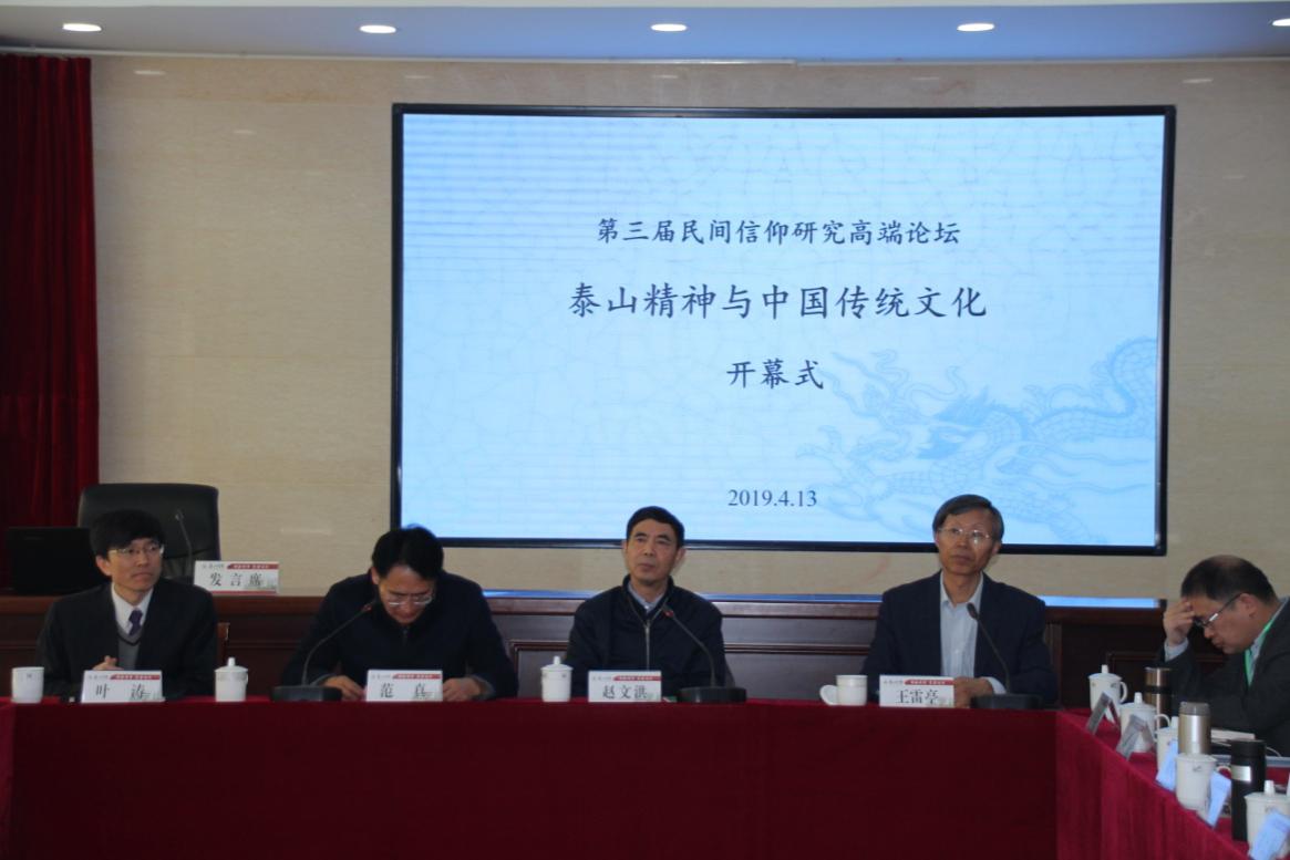 2019年4月13-14日,由中国社会科学院世界宗教研究所、中国宗教学会、泰山学院共同主办的第三届民间信仰研究高端论坛在泰山学院隆重召开,此次会议主题为“泰山精神与中国传统文化”。来自中国社会科学院世界宗教研究所、清华大学、复旦大学、中国政法大学、北京师范大学、中央民族大学、中山大学、河南大学、上海大学、济南大学、上海市社科院、泰山学院、泰山管委会等单位共50余名专家学者会聚一堂,共同研讨泰山文化与泰山精神。