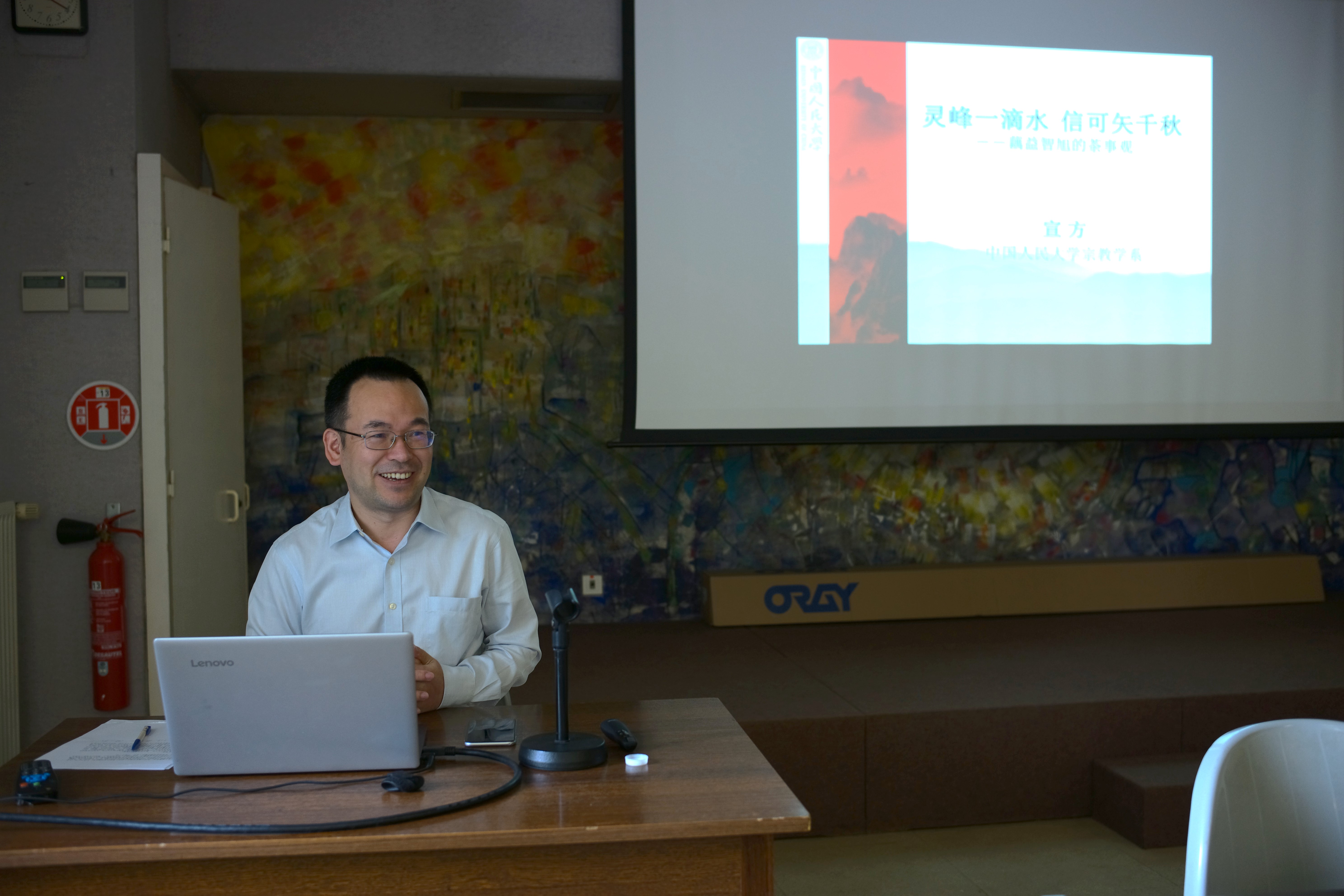 来自中国人民大学的宣方老师分析了晚明高僧蕅益智旭的茶事观及其体现的修行旨趣。指出佛门茶事虽然也不乏闻香品茗的雅致情调,但本质是修行,关键在于即事炼心,在事茶过程中做到如实观照,不纵不夺,而宗门禅茶更是极高明而道中庸,将以禅摄茶的下贯和以茶入禅的上达相统一。他建议初学者尤应重视对身体和茶味的正念正知。