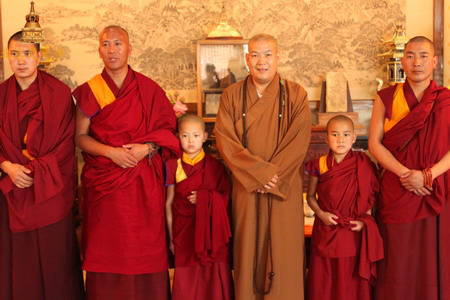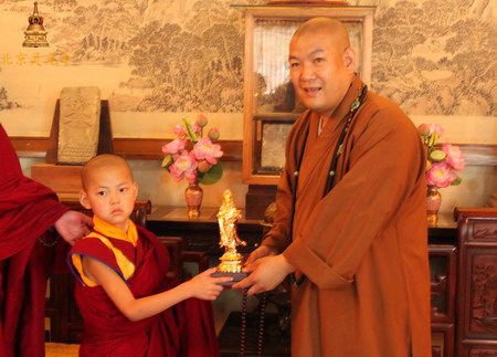 常藏法师祝愿却西仁波切健康成长、勤奋学习、努力提升自己对佛法的学修,既可以切实的弘扬佛法教义,又能契理契机的引导佛教适时应世的发展,同时可以真正的以佛教的义理解决当下信众所面对的问题,做对国家、对佛教有大作为和大贡献的佛门大德。随后,常藏法师赠送却西仁波切纪念品,并与却西仁波切一行合影留念。