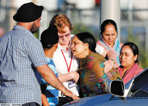 8月5日上午,美国威斯康星州一座锡克教寺庙内,发生枪击事件,已造成7人死亡,多人受伤,包括与警方交火中丧生的一名犯罪嫌疑人。这是继丹佛影院枪击案发生仅半月之久,美国又爆出一次伤亡严重的枪击事件。图为锡克教寺庙一名受到惊吓的妇女。