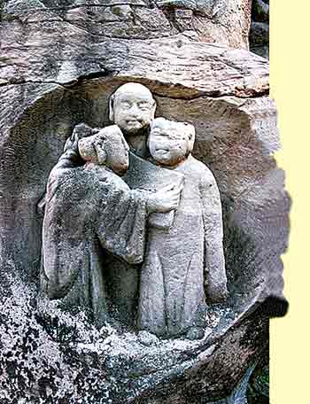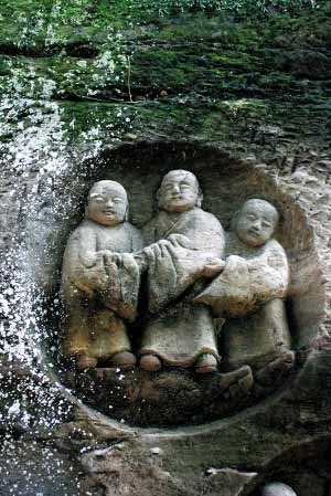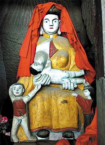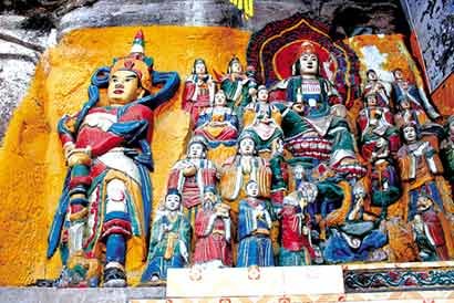 在这些众多的神像中,有据传刻于后五代的“三尊佛”以及千手观音、无量寿佛等佛教造像,又有天皇、仙姑等道教造像,还有反映儒家文化的孔圣人、昭烈帝、诸葛先生、周文王等历史人物的造像。更多的还是民间诸神,像灶王、药王、鲁班、女娲、火神、瘟神、城隍等不一而足。在众多的彩绘石刻造像中,印象最深的还是千手观音和送子娘娘。千手观音雕凿在一块5米见方的石壁上,颇有气势。而送子娘娘完全采用自然主义的表现手法,体态丰盈的送子娘娘右乳袒露,正哺育着双手捧抱的赤身婴儿,膝下一对儿童正在天真地玩乐,两旁的对联也十分口语化:“要养子诚心恭敬,孝父母自然必送”,横批是“一求必应”。