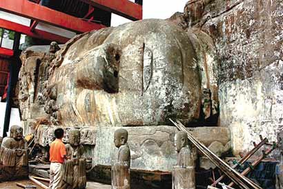 在到现场之前,我也曾见过一些有关卧佛的图片,记得卧佛是凿于山顶,远远的就能看见,还有一句诗形容其“意隐云霞落山崖”。可是当我们的车子从卧佛镇(原名复兴乡,因1983年发现卧佛后于1985年更名)旁的乡道上到半山时,看到的却是在夏日阳光下的宏大庙宇群。随行的镇党政办公室的小廖说,卧佛就在右边的大殿里,原处于露天状态的卧佛因风化严重,从2002年至2004年,有关部门花了近百万元修建了卧佛寺。卧佛寺的建成确实是保护卧佛的善举,却无法再让人远眺气势宏大的“中国第一卧佛”了。
