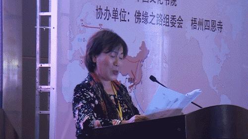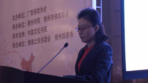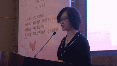 肇庆学院西江研究院副院长叶枝青教授的发言主题为:《理惑论》辩证思想与“一带一路”建设。她将《理惑论》及佛教中的自然辩证思想进行了透彻的分析,包括“无我”“大我”以及佛陀精神等。