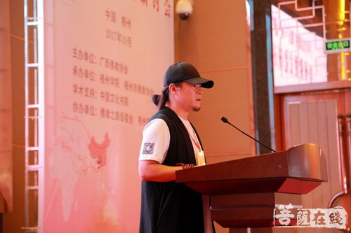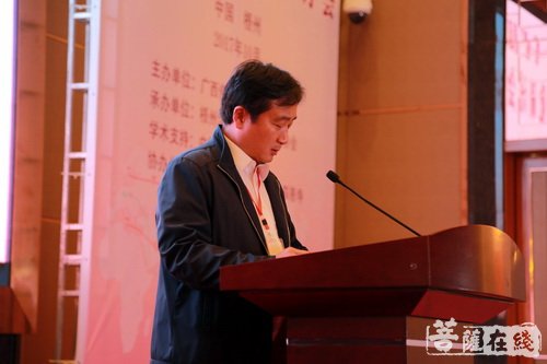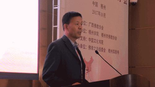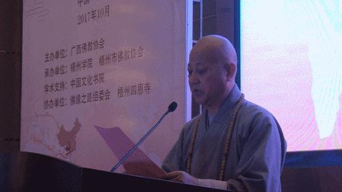 梧州四恩寺住持成清法师代表广西佛协、梧州佛协及广西地区佛教代表致辞表示:他感谢诸位的支持与参与使研讨会顺利召开,本次研讨会是一次学习十九大精神的好形式,希望本次研讨会能在专家学者的建言献策中,加强佛教优秀传统文化的发掘。